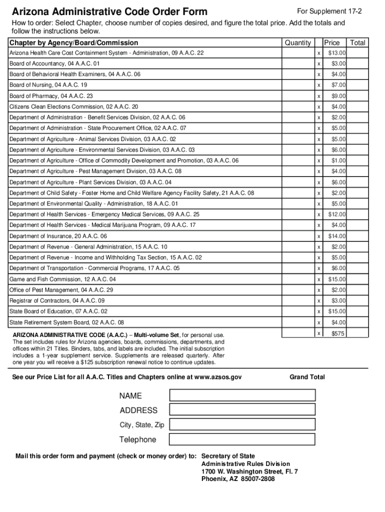 Arizona Administrative Code Order Former Supplement 172How to order: Select Chapter, choose number of copies desired, and figure the total price. Add the totals and follow the instructions below.