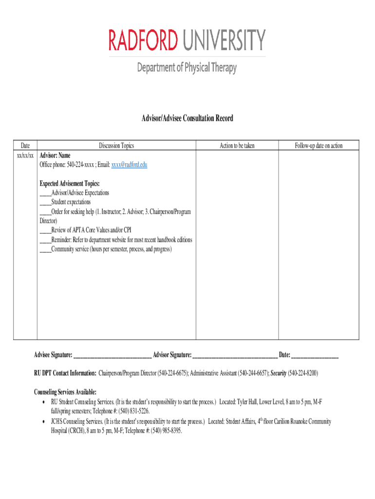 Advisor/Advisee Consultation Record Date xx/xx/discussion Topics Advisor: Name Office phone: 540224xxxx ; Email: XXX Bradford. Education to be takenFollowup date on actionExpected Advisement Topics: