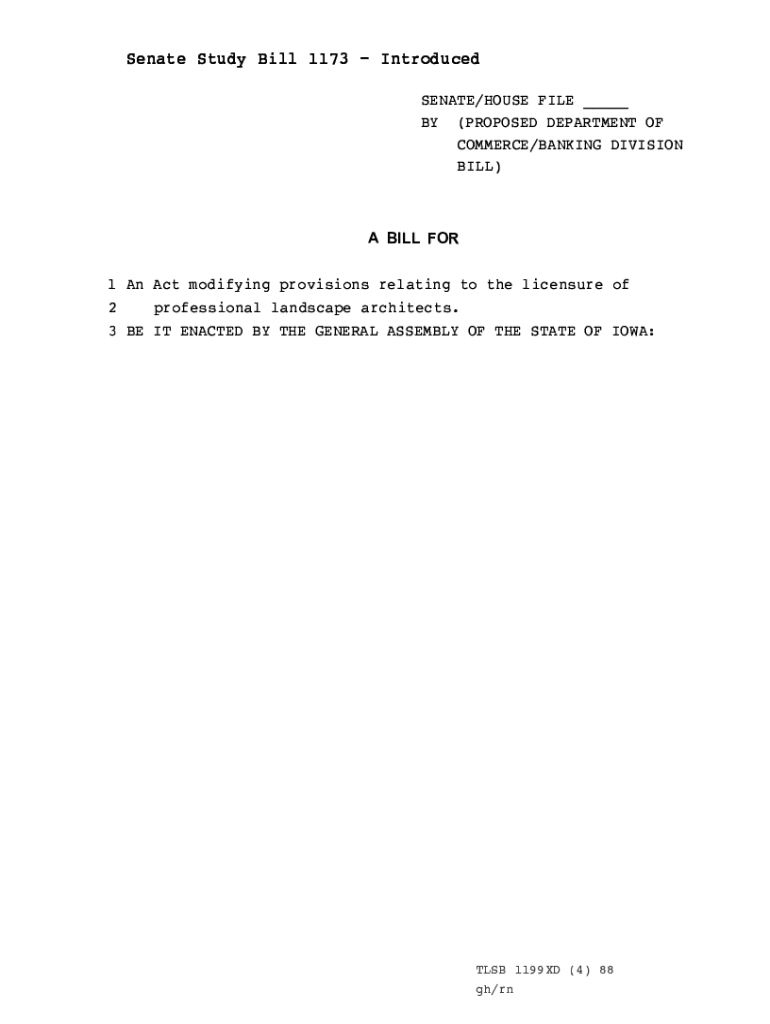 Senate Study Bill 1173 Introduced SENATE/HOUSE FILE BY (PROPOSED DEPARTMENT OF COMMERCE/BANKING DIVISION BILL)A BILL FOR1 An Act modifying provisions relating to the licensure of 2 professional landscape