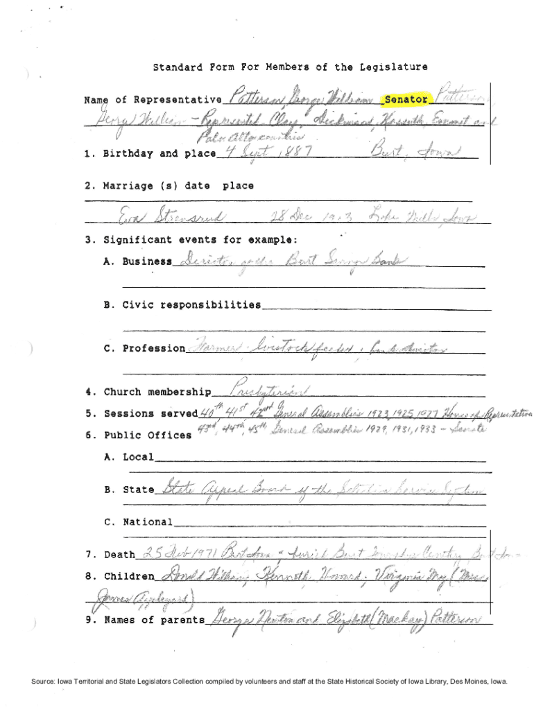 Standard Form For Members of the Legislature Senator2. Marriage (s) date/ 1?. , place I ('Of...f. l! 3. Significant events for example: A. Business!r A.’t. T;./;/t.vl1, :l '.j Jr(' ', ;:, t;B. Civic