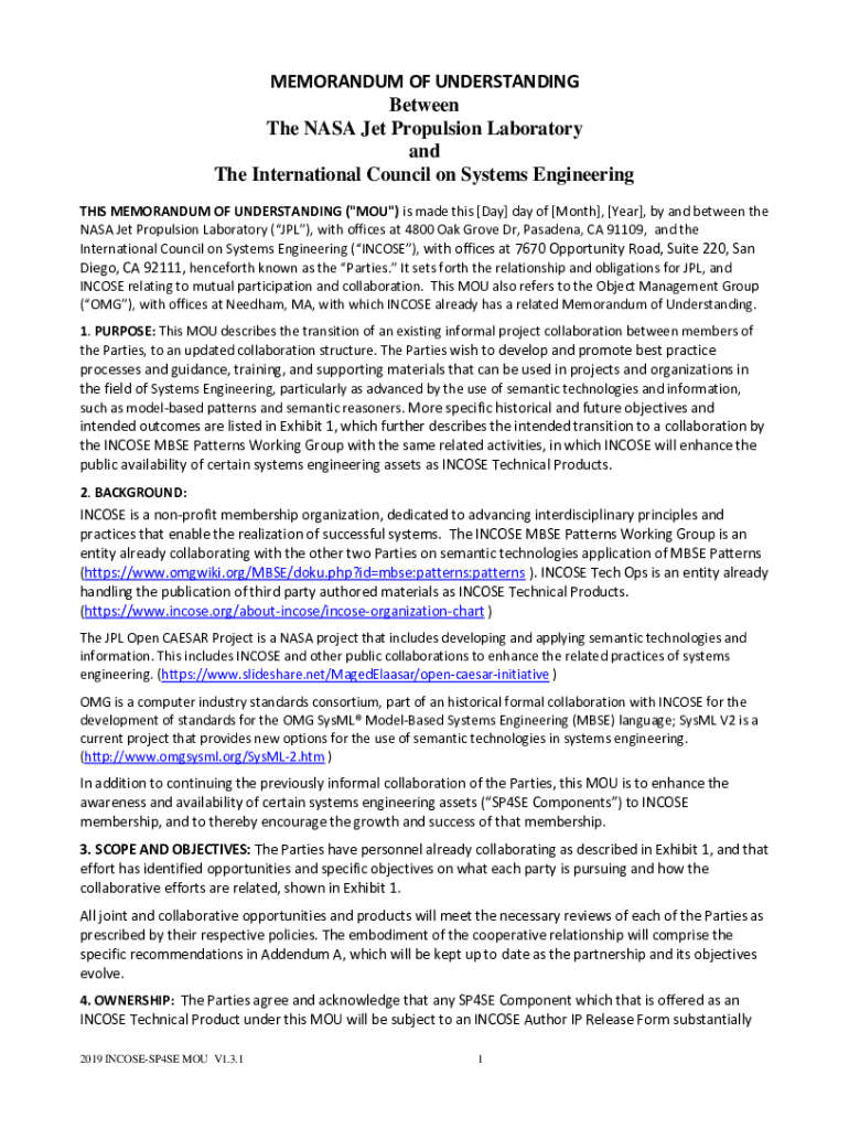 MEMORANDUM OF UNDERSTANDING Between The NASA Jet Propulsion Laboratory and The International Council on Systems Engineering THIS MEMORANDUM OF UNDERSTANDING (“YOU “) is made this Day of Month,