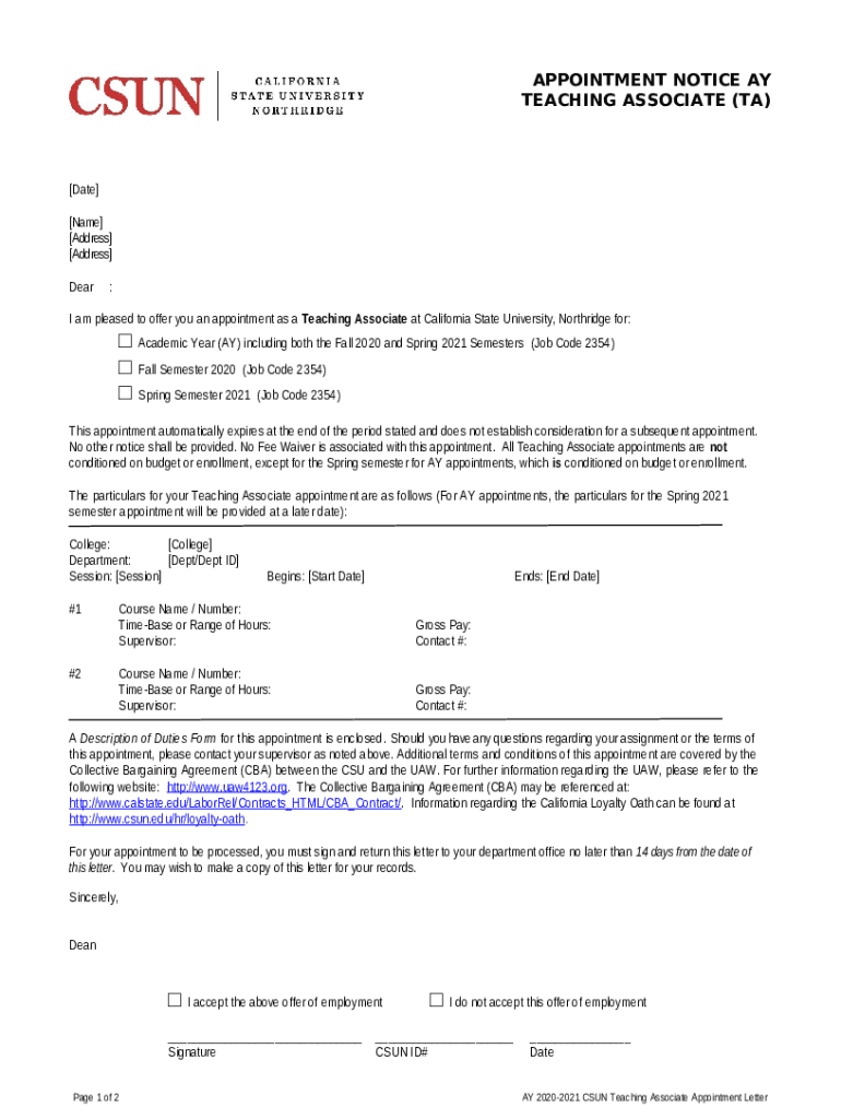 How to fill 2020-2021 TA Appointment Template - California State ... word template