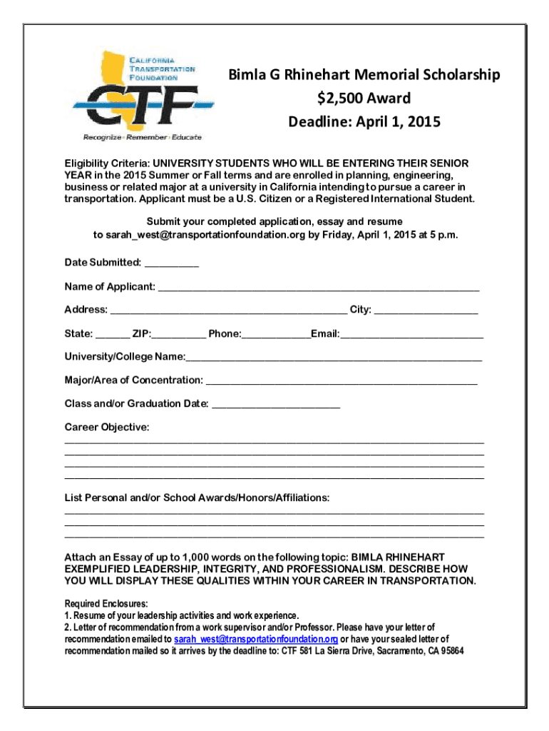 Get the free Bimla G Rhinehart Memorial Scholarship $2,500 Award ...