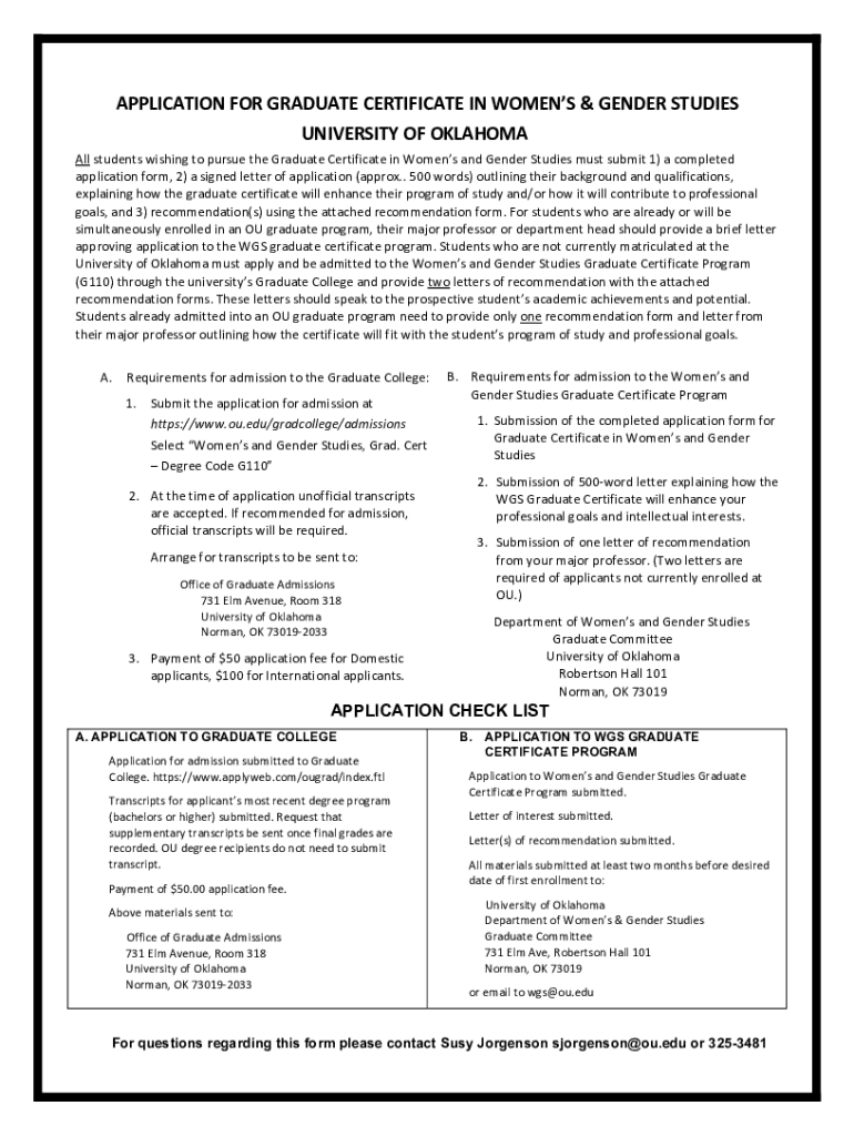 APPLICATION FOR GRADUATE CERTIFICATE IN WOMEN & GENDER STUDIES UNIVERSITY OF OKLAHOMA All students wishing to pursue the Graduate Certificate in Women's and Gender Studies must submit 1) a completed