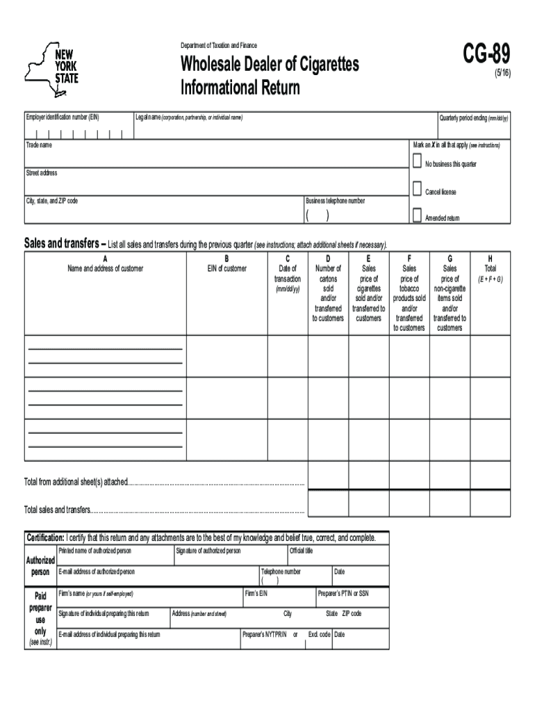 CG89Department of Taxation and FinanceWholesale Dealer of Cigarettes Informational Return Employer identification number (EIN)(5/16)Legal name (corporation, partnership, or individual name)Quarterly