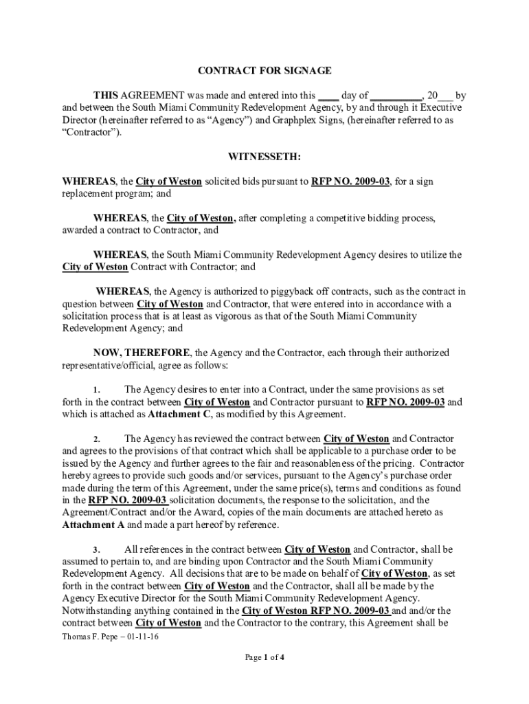 CONTRACT FOR SIGNAGE THIS AGREEMENT was made and entered into this day of, 20 by and between the South Miami Community Redevelopment Agency, by and through it Executive Director (hereinafter referred