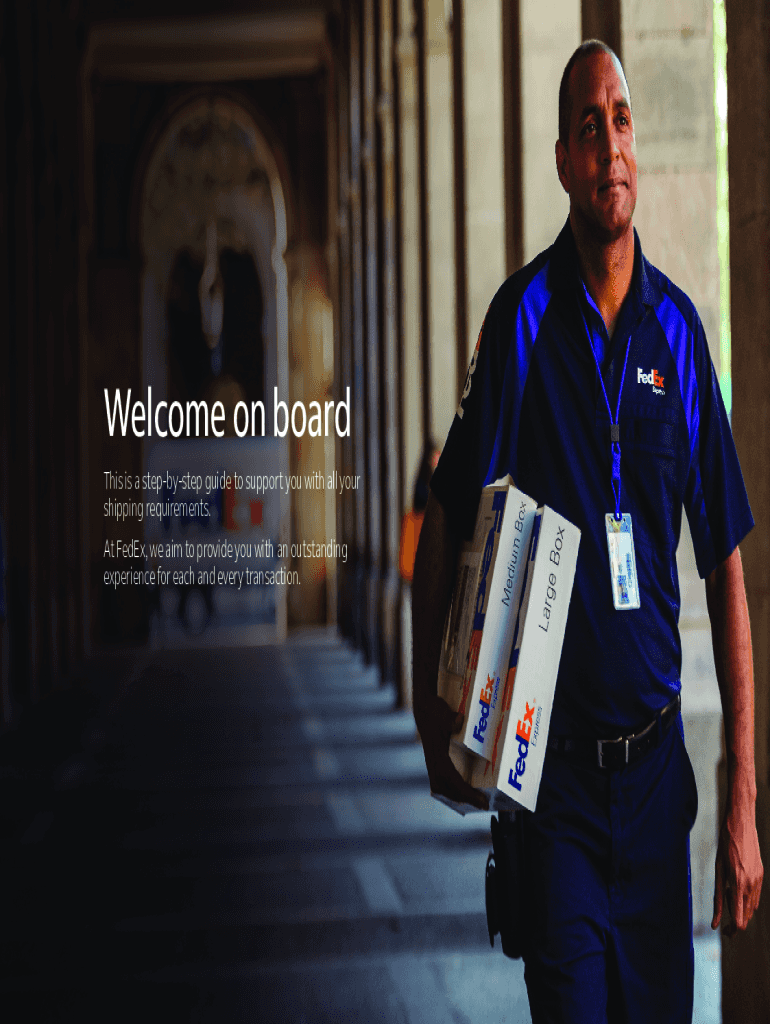 Welcome on board This is a stepsister guide to support you with all your shipping requirements. At FedEx, we aim to provide you with an outstanding experience for each and every transaction. CONTENTS