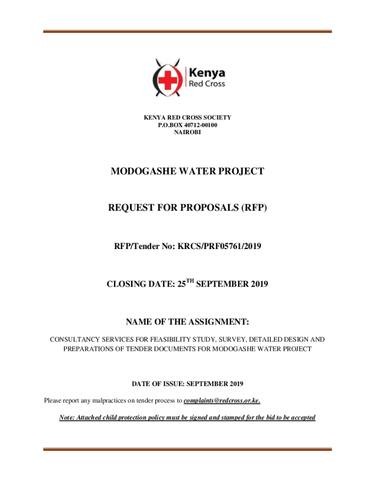 NAIROBIMODOGASHE WATER PROJECTREQUEST FOR PROPOSALS (RFP)RFP/Tender No: ARCS/PRF05761/2019CLOSING DATE: 25TH SEPTEMBER 2019NAME OF THE ASSIGNMENT: