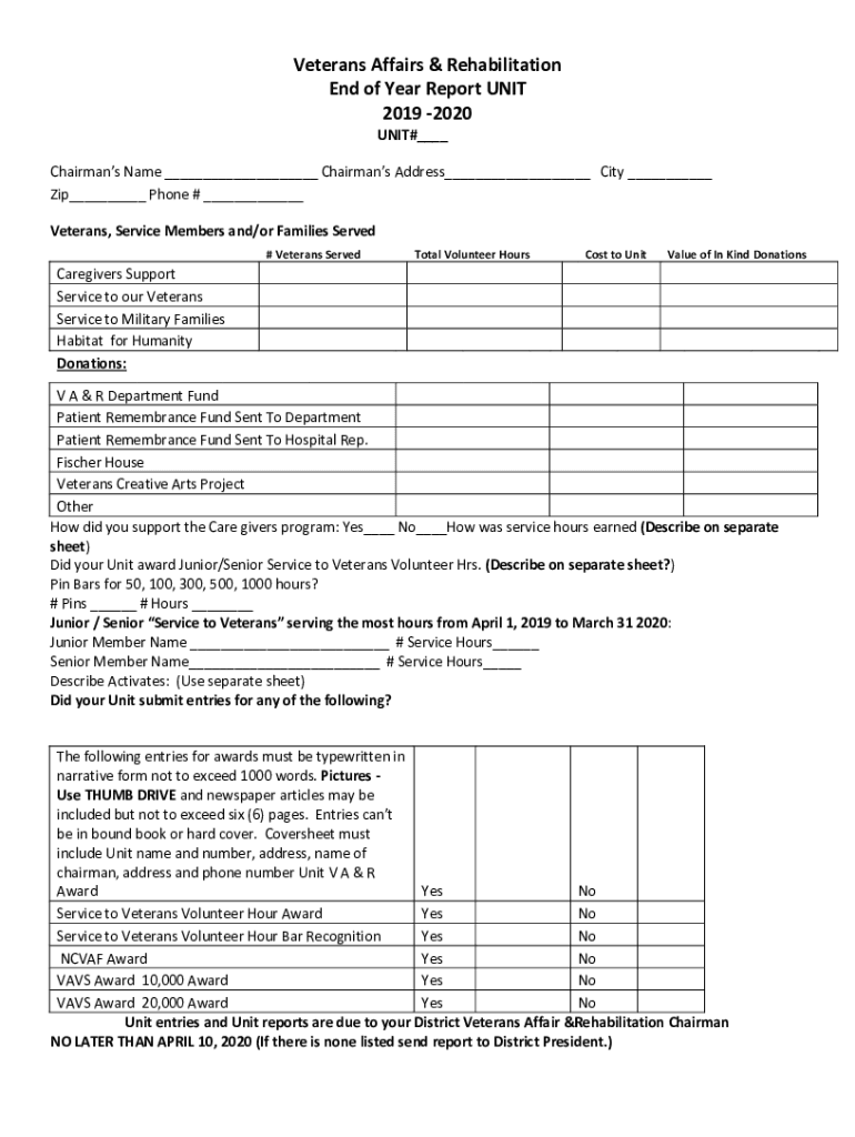 Veterans Affairs & Rehabilitation End of Year Report UNIT 2019 2020 UNIT# Chairman Name Chairman Address City Zip Phone # Veterans, Service Members and/or Families Served # Veterans ServedTotal Volunteer
