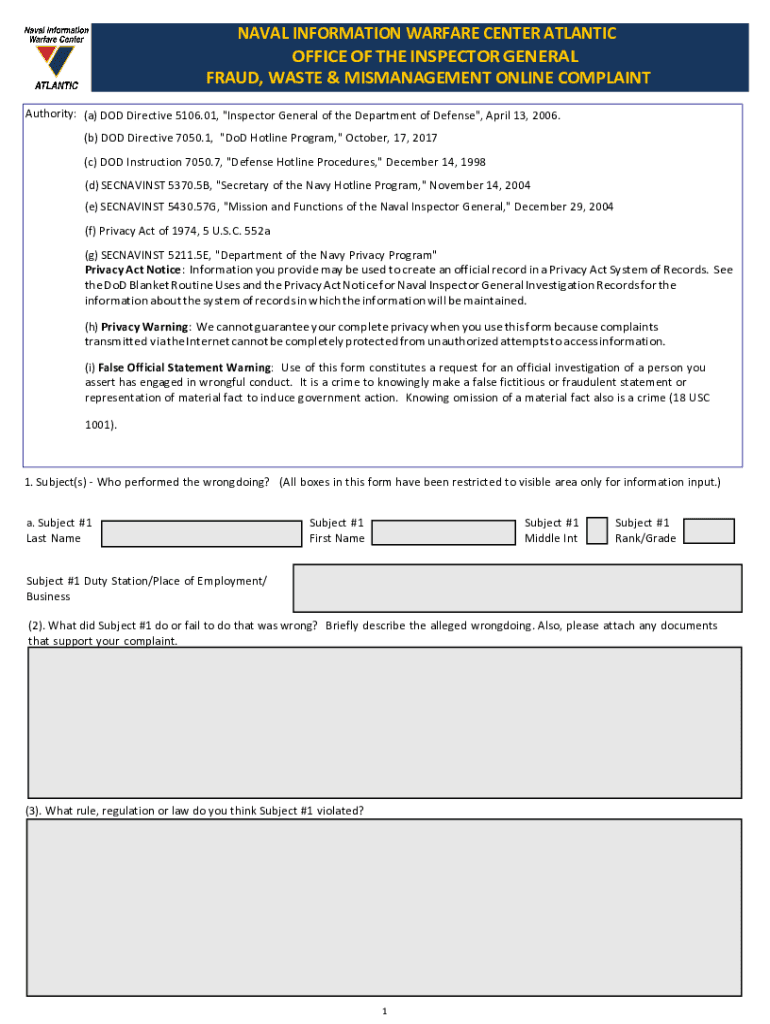 NAVAL INFORMATION WARFARE CENTER ATLANTIC OFFICE OF THE INSPECTOR GENERAL FRAUD, WASTE MISMANAGEMENT PART 1:GENERAL INFORMATION ONLINE COMPLAINT Authority: (a) DOD Directive 5106.01, “Inspector