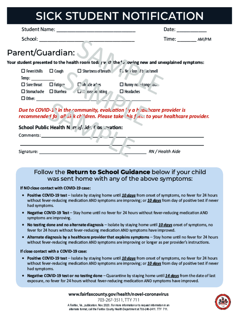 SICK STUDENT NOTIFICATION Student Name: Date: School: Time: AM/PM SAM P SAM LE P SAM LE Prepared/Guardian:Your student presented to the health room today with the following new and unexplained symptoms: