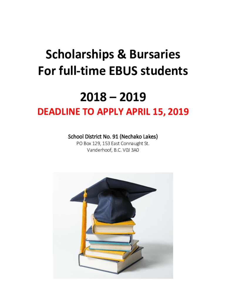 Scholarships & Bursaries For full time BUS students 2018 2019 DEADLINE TO APPLY APRIL 15, 2019, School District No. 91 (Neck Lakes) PO Box 129, 153 East Conn aught St. Vanderhoof, B.C. V0J 3A0Table