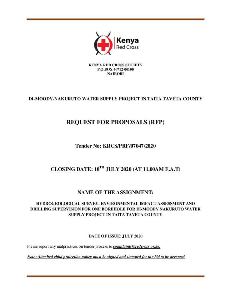 NAIROBIDIMOODYNAKURUTO WATER SUPPLY PROJECT IN TAIGA TAVERN COUNTYREQUEST FOR PROPOSALS (RFP)Tender No: ARCS/PRF/07047/2020CLOSING DATE: 10TH JULY 2020 (AT