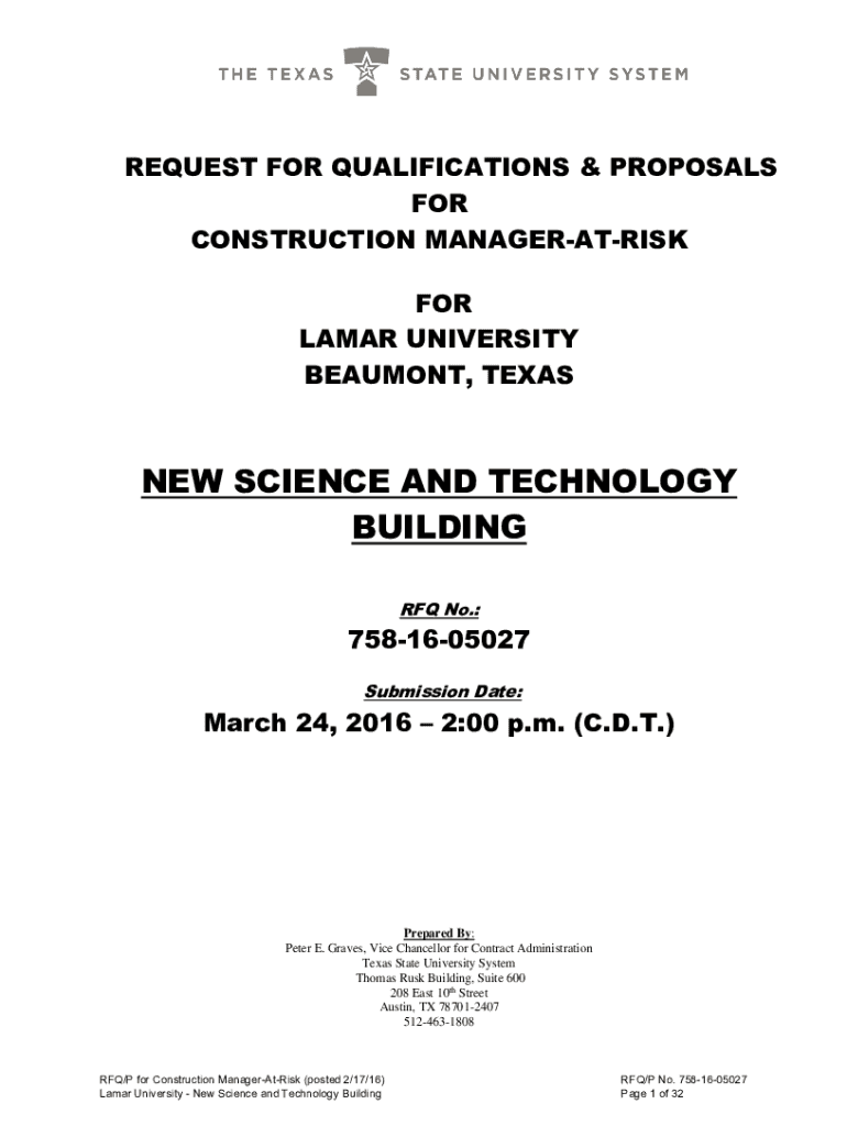 REQUEST FOR QUALIFICATIONS & PROPOSALS FOR CONSTRUCTION MANAGERATRISK FOR LAMAR UNIVERSITY BEAUMONT, TEXAS SCIENCE AND TECHNOLOGY BUILDING RFQ No.:7581605027 Submission Date:March 24, 2016 2:00 p.m.