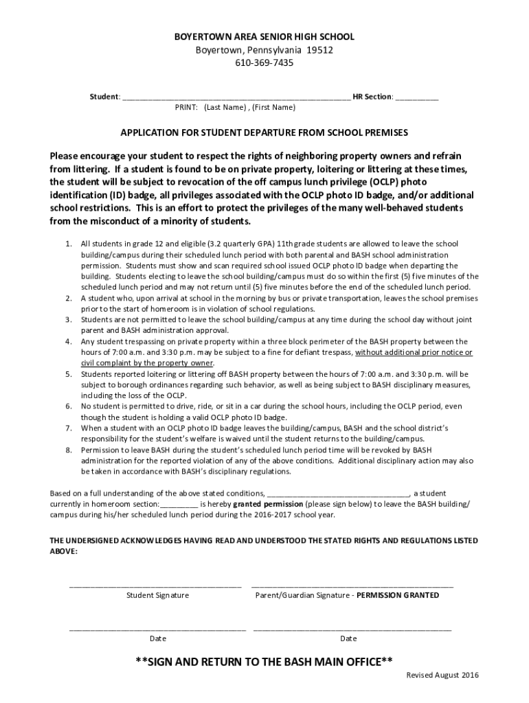 HOMETOWN AREA SENIOR HIGH SCHOOL Boyer town, Pennsylvania 19512 6103697435 Student: HR Section: PRINT: (Last Name), (First Name)APPLICATION FOR STUDENT DEPARTURE FROM SCHOOL PREMISES Please encourage