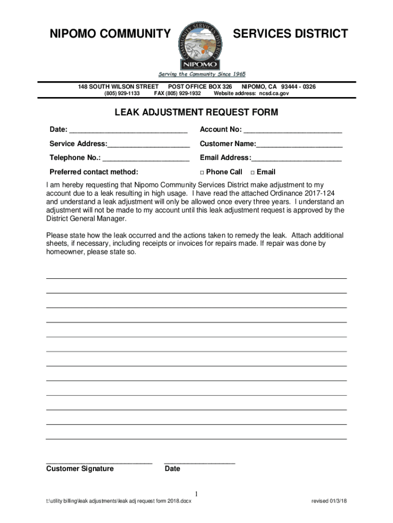 NIP OMO COMMUNITYSERVICES DISTRICTServing the Community Since 1965148 SOUTH WILSON STREET (805) 9291133POST OFFICE BOX 326FAX (805) 9291932NIPOMO, CA 93444 0326Website address: CSD.ca.govern ADJUSTMENT