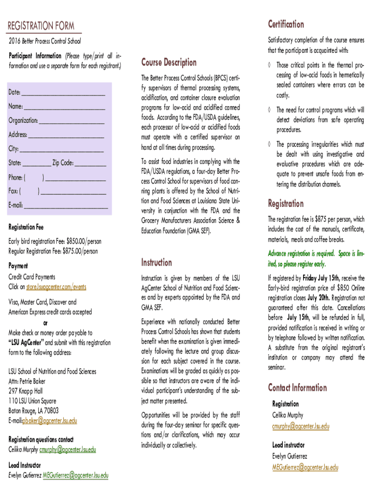 REGISTRATION FORMCertification2016 Better Process Control SchoolSatisfactory completion of the course ensures that the participant is acquainted with:Participant Information (Please type/print all