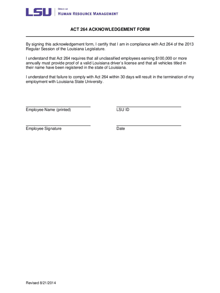 Get the free Act 264 Acknowledgement Form - Louisiana State University