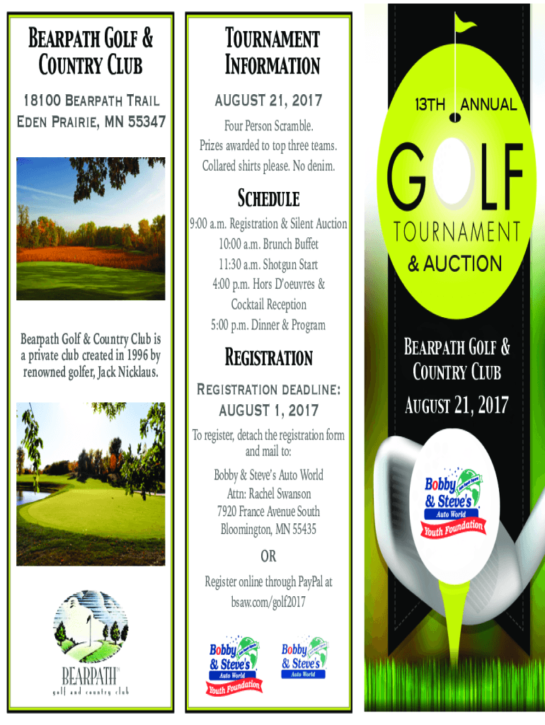 Bear path Golf & Country Club 18100 Bear path Trail Eden Prairie, MN 55347Tournament Information AUGUST 21, 201713THANNUALFour Person Scramble. Prizes awarded to top three teams. Collared shirts please.