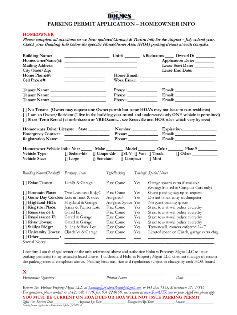 PARKING PERMIT APPLICATION HOMEOWNER INFO HOMEOWNER:Please complete all questions, so we have updated Contact & Tenant info for the August July school year. Check your Building Info below for specific