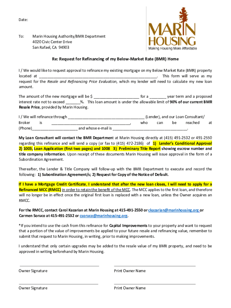 Get the free Re: Request for Refinancing of my Below-Market Rate (BMR) Home