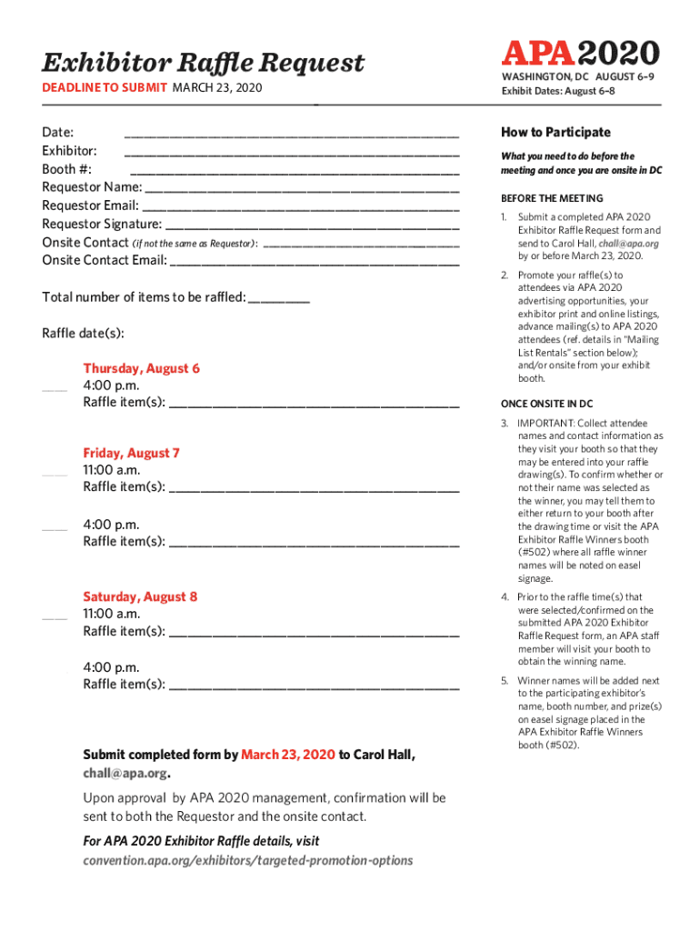 Exhibitor Raffle RequestDEADLINE TO SUBMIT MARCH 23, 2020WASHINGTON, DC AUGUST 69 Exhibit Dates: August 68 How to Participate Date: What you need to do before the Exhibitor: Booth #: meeting and once