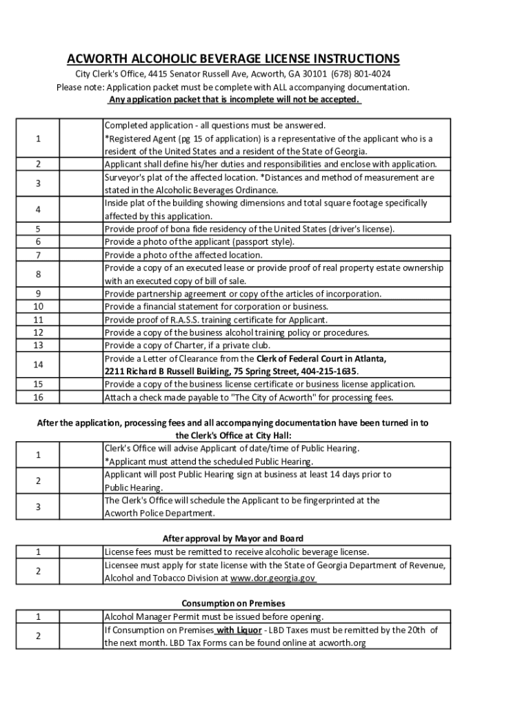 WORTH ALCOHOLIC BEVERAGE LICENSE INSTRUCTIONS City Clerk's Office, 4415 Senator Russell Ave, Ac worth, GA 30101 (678) 8014024 Please note: Application packet must be complete with ALL accompanying