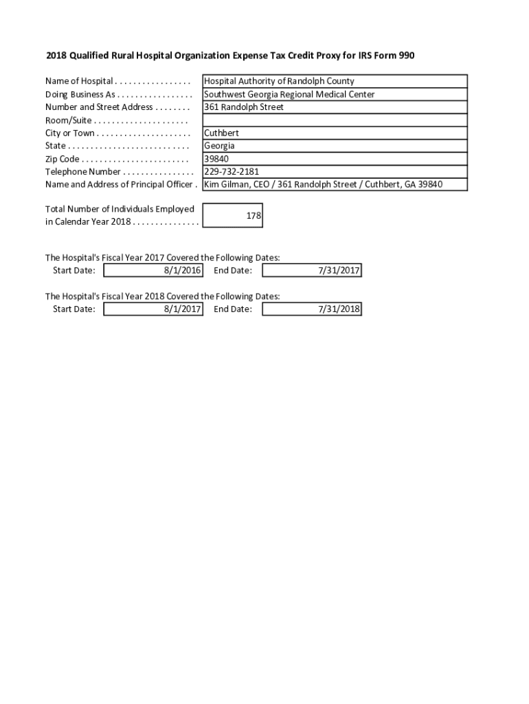 2018 Qualified Rural Hospital Organization Expense Tax Credit Proxy for IRS Form 990 Name of Hospital. . . . . . . . . . . . . . . . . Doing Business As. . . . . . . . . . . . . . . . . Number and