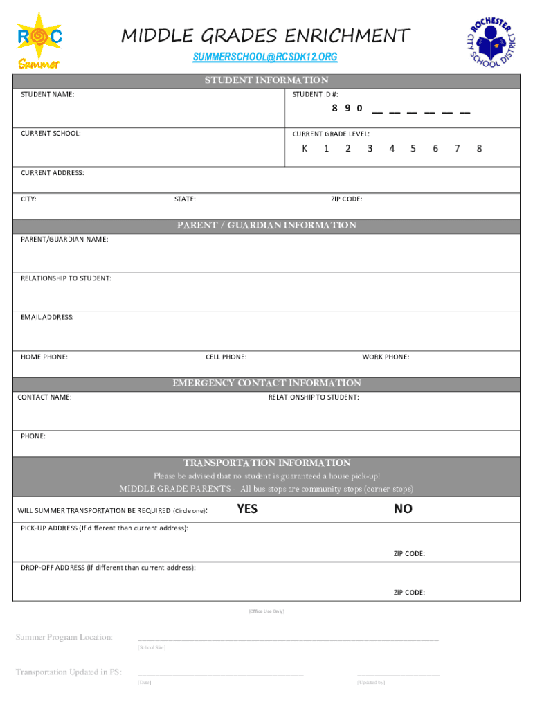 MIDDLE GRADES ENRICHMENT SUMMERSCHOOL RCSDK12.ORG STUDENT INFORMATION STUDENT NAME:STUDENT ID #:8 9 0 CURRENT SCHOOL:CURRENT GRADE LEVEL:K123456CURRENT ADDRESS: CITY:STATE:ZIP CODE:PARENT / GUARDIAN