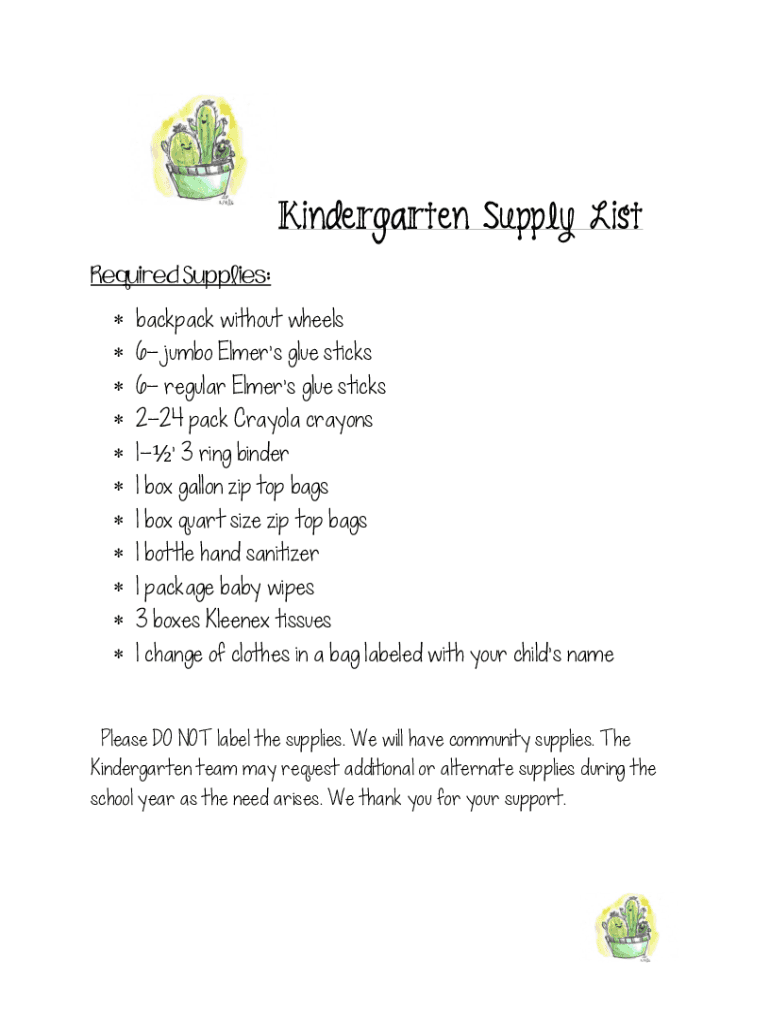 Kindergarten Supply List Required Supplies: backpack without wheels 6 jumbo Elmer's glue sticks 6 regular Elmer's glue sticks 224 pack Crayola crayons 1 3 ring binder 1 box gallon zip top bags 1 box