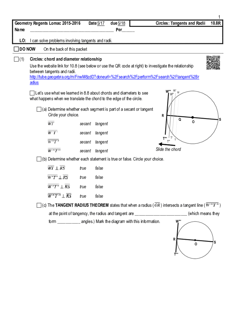 Geometry Regents Lomac 20152016 Date 5/17 due 5/18 Name Per Circles: Tangents and Radii1 10.8RLO: I can solve problems involving tangents and radii. C DO Now (1)On the back of this packetCircles: