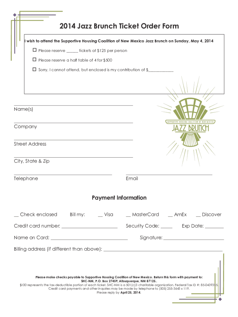 2014 Jazz Brunch Ticket Order Form I wish to attend the Supportive Housing Coalition of New Mexico Jazz Brunch on Sunday, May 4, 2014Please reserve tickets at $125 per personPlease reserve a half