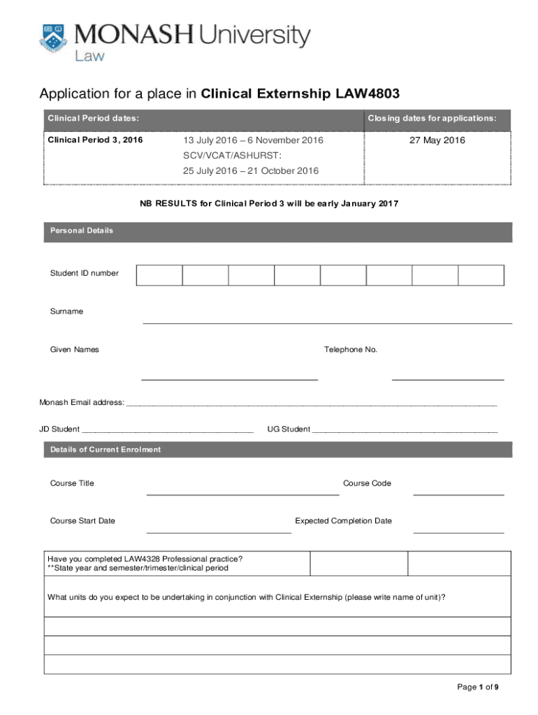 Get the free Application for a place in Clinical Externship LAW4803 - Monash ...
