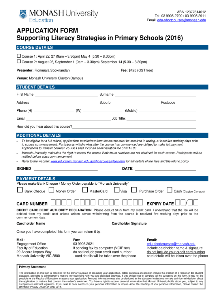 ABN 12377614012 Tel: 03 9905 2700 / 03 9905 2911 Email: edushortcourses Monash. Application FORM Supporting Literacy Strategies in Primary Schools (2016) COURSE DETAILS Course 1: April 22, 27 (9am