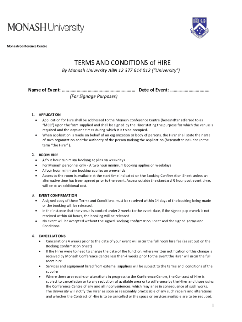 Monash Conference Centimeters AND CONDITIONS of HIRE By Monash University ABN 12 377 614 012 (University)Name of Event: Date of Event:. (For Signage Purposes)1.APPLICATION for Hire shall be addressed