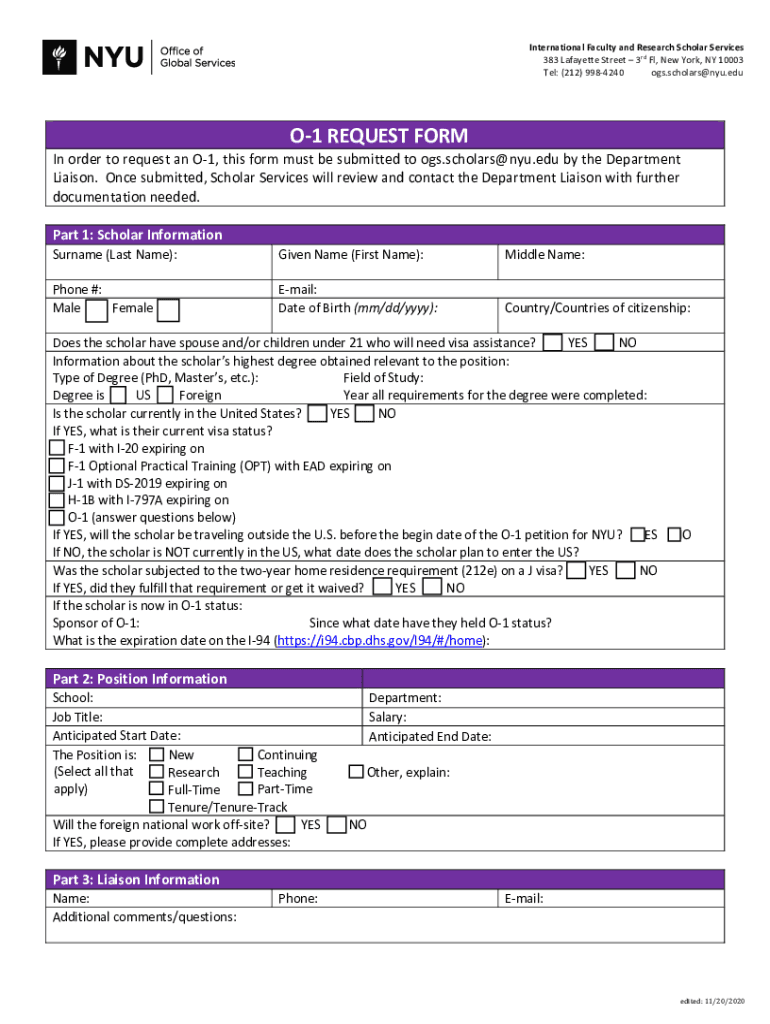 International Faculty and Research Scholar Services 383 Lafayette Street 3rd Fl, New York, NY 10003 Tel: (212) 9984240 dogs. Scholars NYU.eduO1 REQUEST Forming order to request an O1, this form must