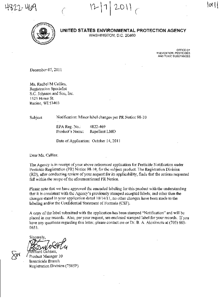 7.0 f UNITED STATES ENVIRONMENTAL PROTECTION AGENCY WASHINGTON, D.C. 20460OFFICE OF PREVENTION. PESTICIDES AND TOXIC SUBSTANCES December 07, 2011, Ms. Rachel MC allies, Registration Specialist S.C.