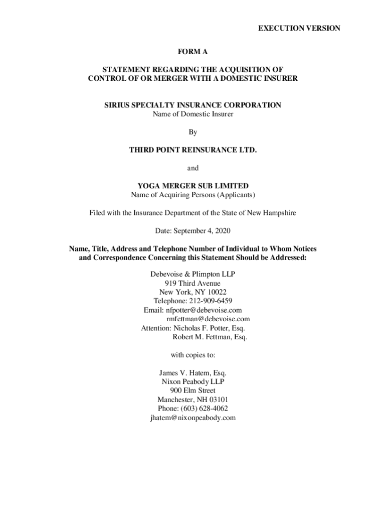 CONTROL OF OR MERGER WITH A DOMESTIC INSURERSIRIUS SPECIALTY INSURANCE CORPORATION