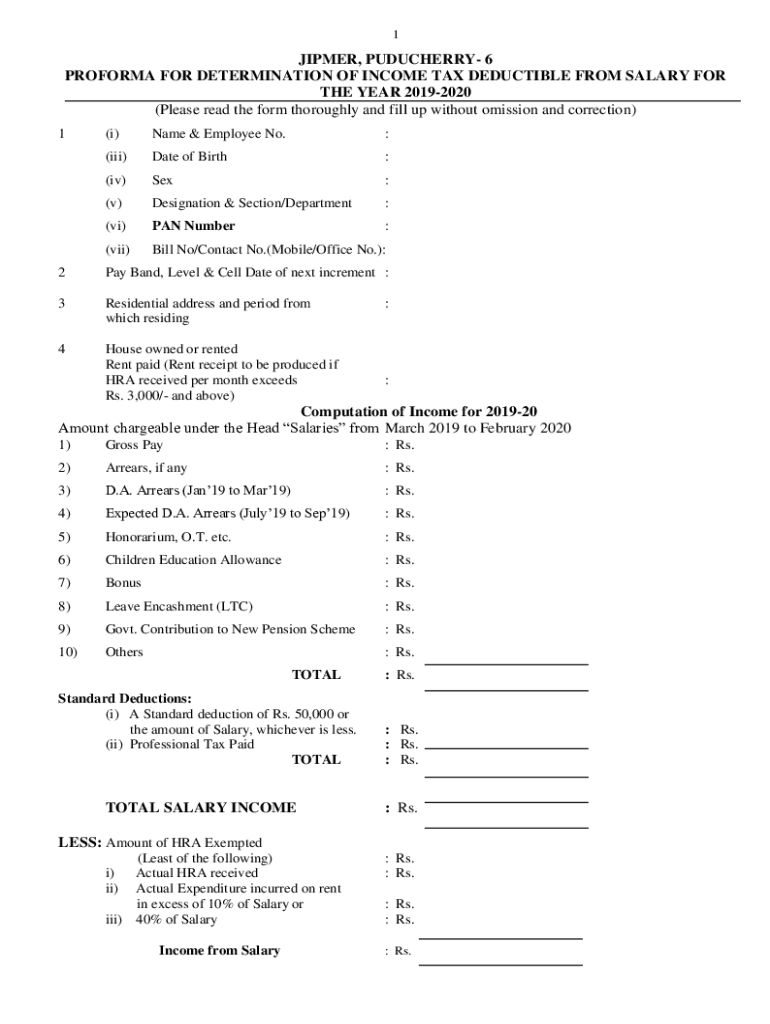 1JIPMER, PONDICHERRY 6 PROFORMA FOR DETERMINATION OF INCOME TAX DEDUCTIBLE FROM SALARY FOR THE YEAR 20192020 (Please read the form thoroughly and fill up without omission and correction) 1(i)Name