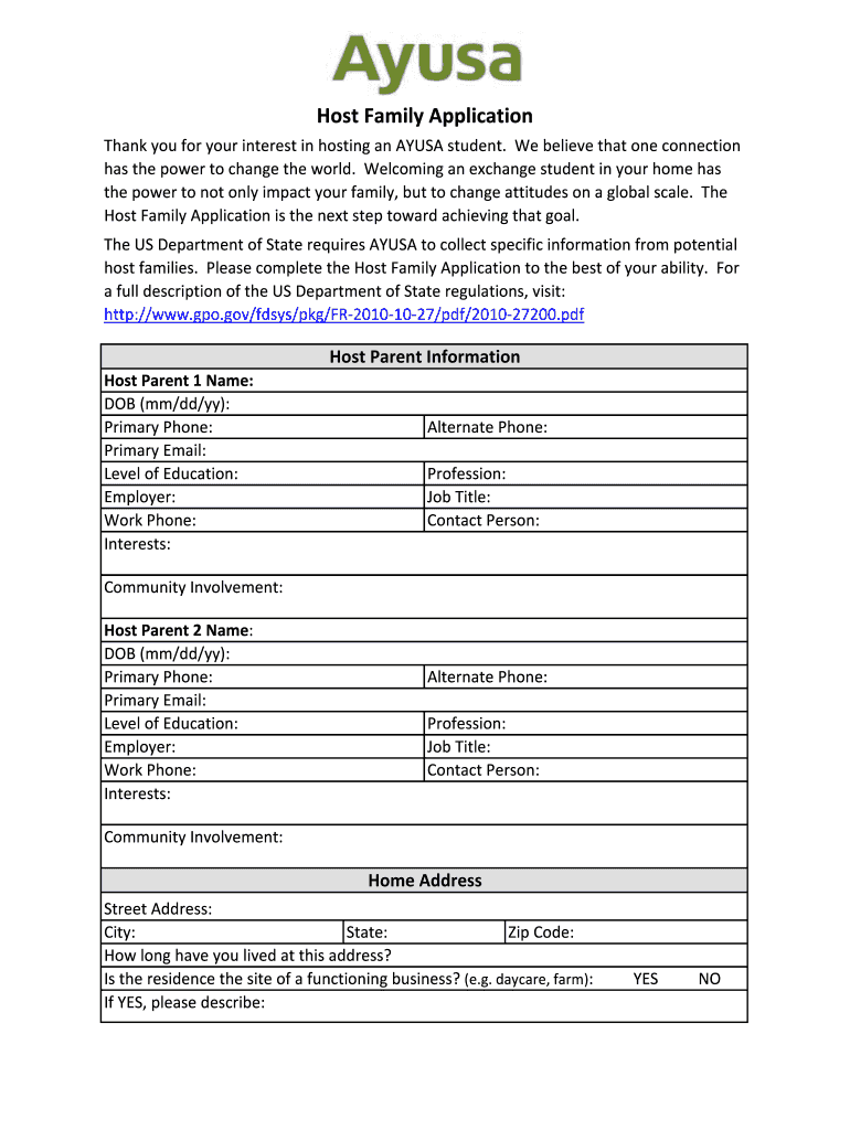The Host Family Application is a personal form used by AYUSA to collect information from potential host families for exchange students.