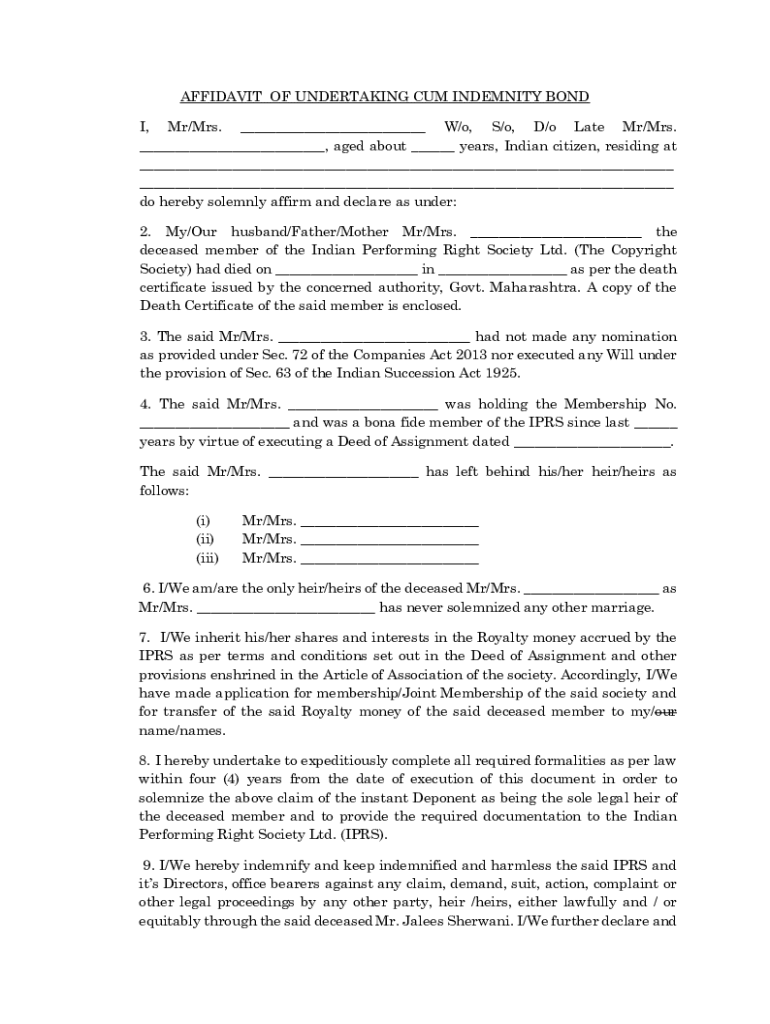 AFFIDAVIT OF UNDERTAKING Come INDEMNITY BOND I, Mr/Mrs. W/o, S/o, D/o Late Mr/Mrs., aged about years, Indian citizen, residing at do hereby solemnly affirm and declare as under: 2. My/Our husband/Father/Mother