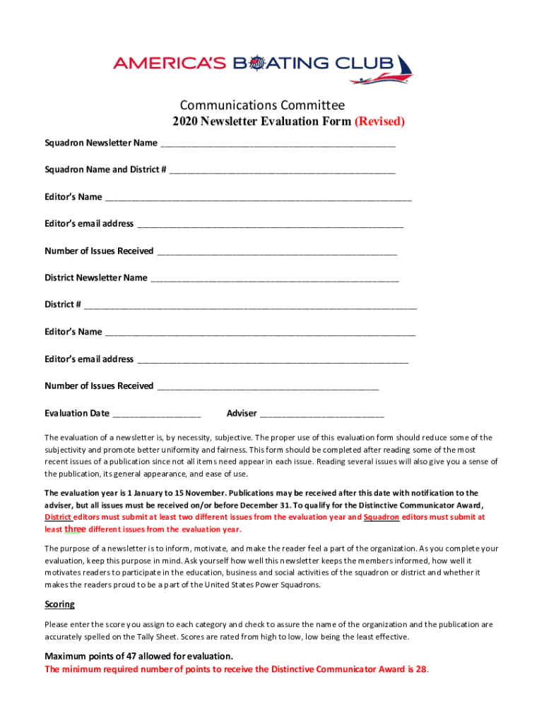 Communications Committee2020 Newsletter Evaluation Form (Revised) Squadron Newsletter Name Squadron Name and District # Editors Name Editors email address Number of Issues Received District Newsletter
