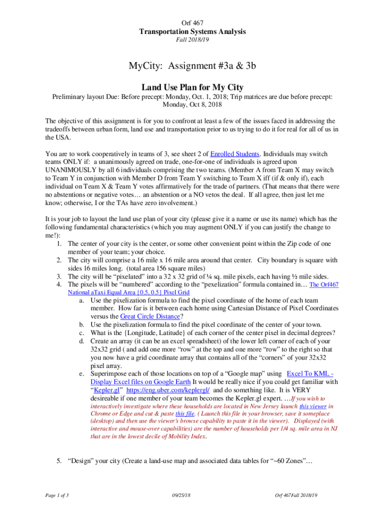 Of 467Transportation Systems Analysis Fall 2018/19MyCity: Assignment #3a & 3b Land Use Plan for My City Preliminary layout Due: Before precept: Monday, Oct. 1, 2018; Trip matrices are due before precept:
