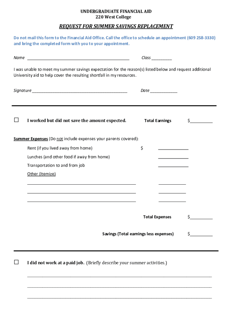 UNDERGRADUATE FINANCIAL AID 220 West CollegeREQUEST FOR SUMMER SAVINGS REPLACEMENT Do not mail this form to the Financial Aid Office. Call the office to schedule an appointment (609 2583330) and bring
