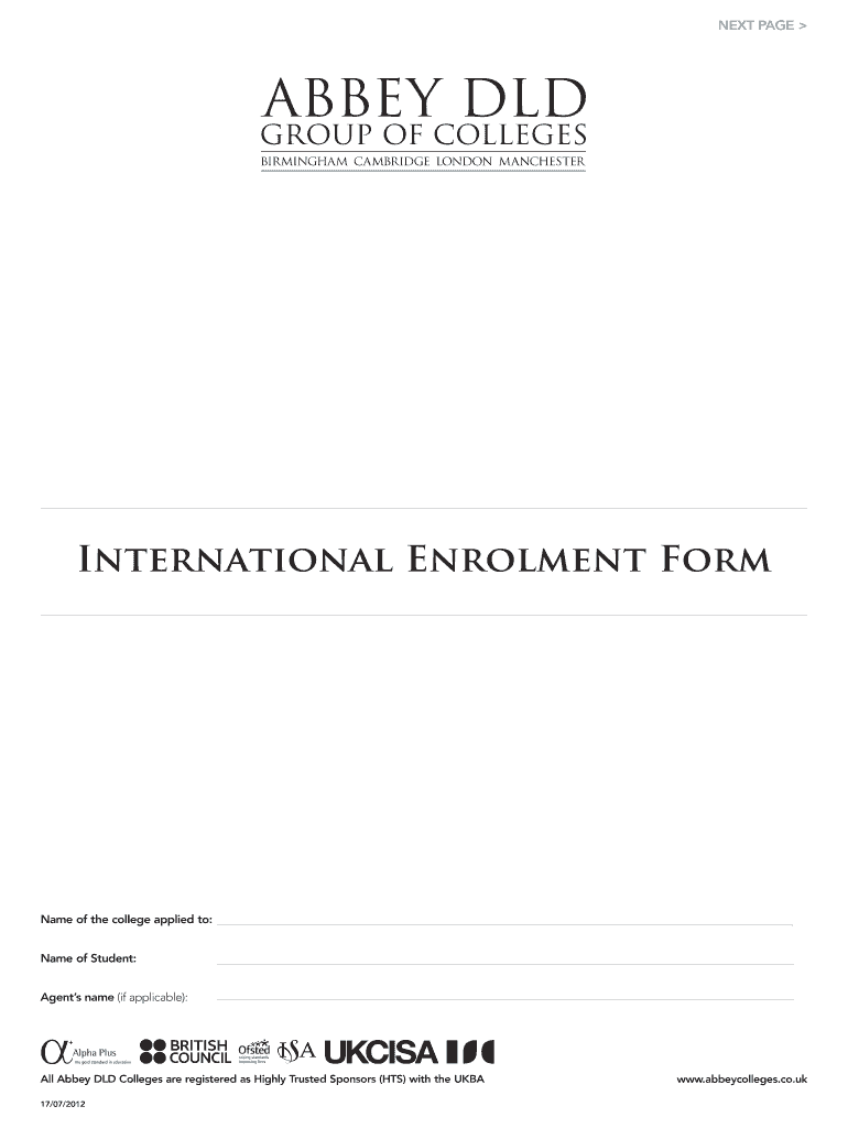 NEXT PAGE International Enrollment Form Name of the college applied to: Name of Student: Agent s name (if applicable): All Abbey DID Colleges are registered as Highly Trusted Sponsors (HTS) with the