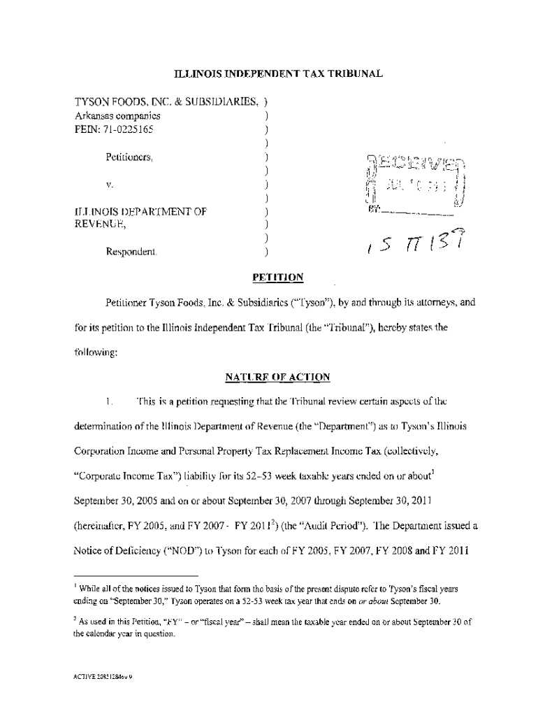ILLINOIS INDEPENDENT TAX TRIBUNALTYSON FOODS, INC. & SUBSIDIARIES, ) ) Arkansas companies) VEIN: 710225165 Petitioners, v. ILLINOIS DEPARTMENT OF REVENUE, Respondent.) ))))))))PETITIONPetitioner Tyson