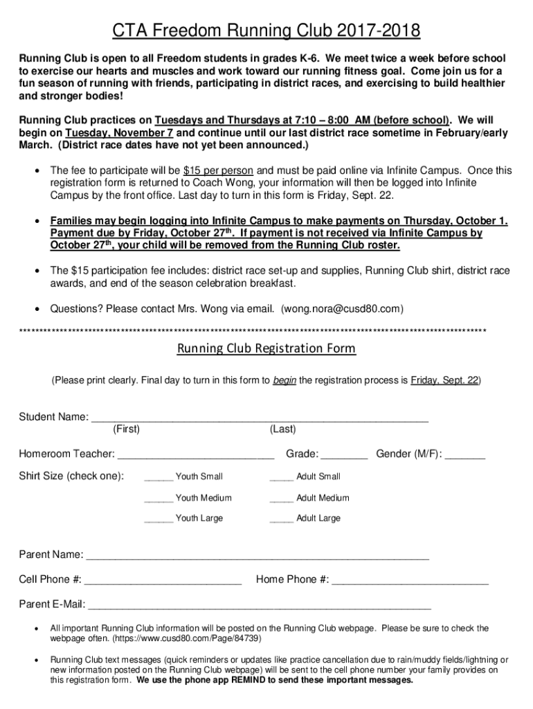 CTA Freedom Running Club 20172018 Running Club is open to all Freedom students in grades K6. We meet twice a week before school to exercise our hearts and muscles and work toward our running fitness