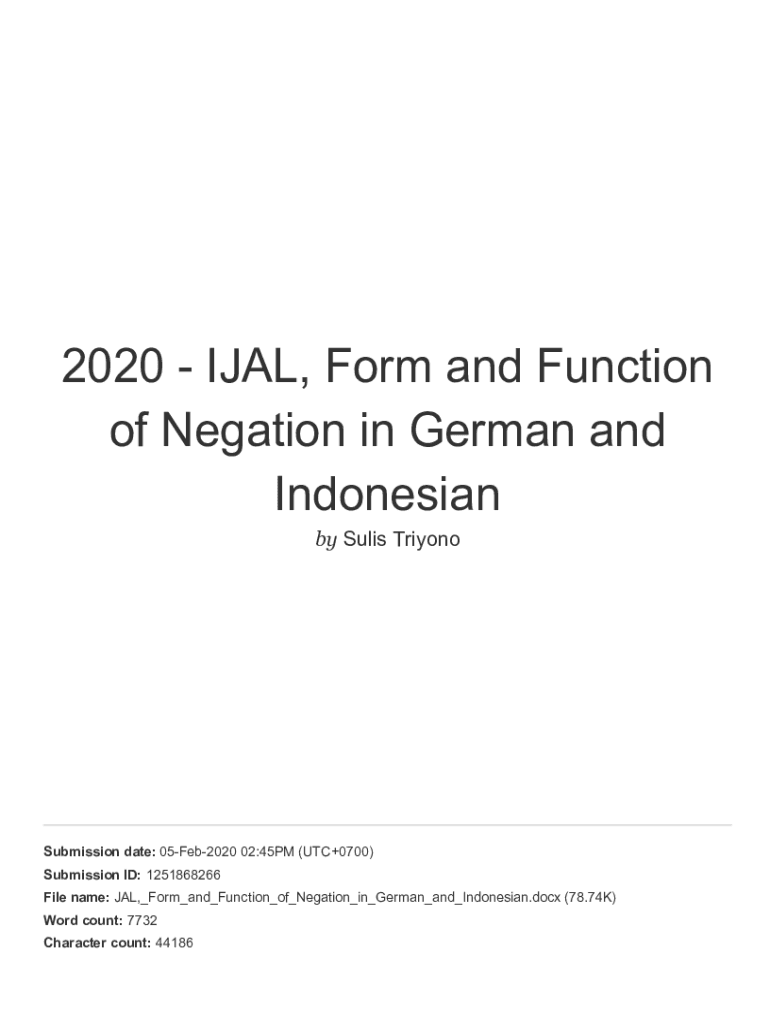 2020 JAL, Form and Function of Negation in German and Indonesian by Solis TriyonoSubmission date: 05Feb2020 02:45PM (UTC+0700) Submission ID: 1251868266 File name: JAL, Form and Function of Negation