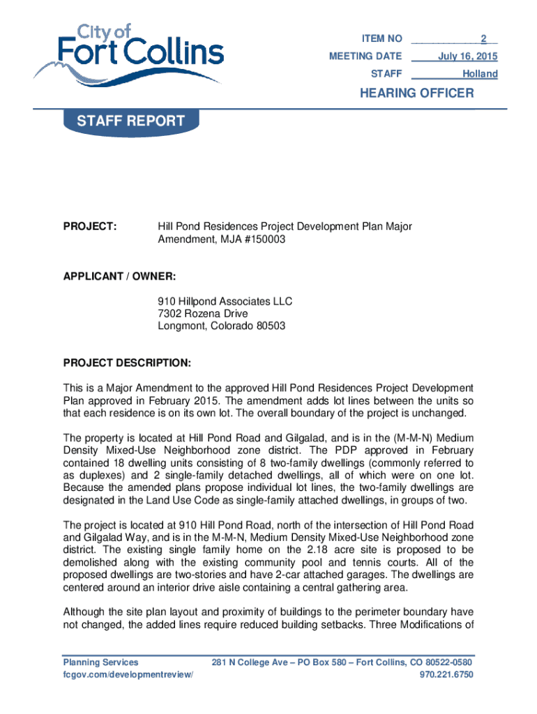 ITEM NO 2 MEETING DATE July 16, 2015STAFFHollandHEARING OFFICERSTAFF REPORTPROJECT:Hill Pond Residences Project Development Plan Major Amendment, MA #150003APPLICANT / OWNER: 910 Millpond Associates