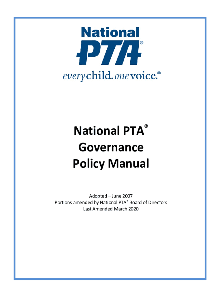 National PTA Governance Policy Manual Adopted June 2007 Portions amended by National PTA Board of Directors Last Amended March 2020PTA Vision Every children potential is a reality PTA Mission To make
